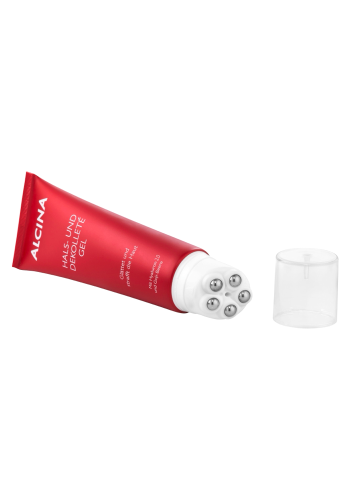 Neck and Décolleté are delicate areas prone to wrinkles but often neglected in daily skincare routines. The intensively moisturizing ALCINA Neck and Décolleté Gel with Hyaluron 2.0 and Goji Berry helps to tighten the skin, smooth wrinkles and increase elasticity. Massage with the metal balls stimulates circulation, the cooling effect refreshes and revitalizes the skin. The tissue appears firmer and collagen production is stimulated. Does not stick, does not grease and is quickly absorbed.